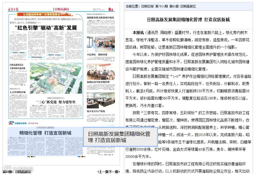 今年以来,为保护好园林绿化成果,促进园林养护管理技术操作规范化,提高园林绿化养护管理质量和水平,日照高新发展集团引入网格化城市园林建设与管护制度,全面实施城市园林建设精细化管理。