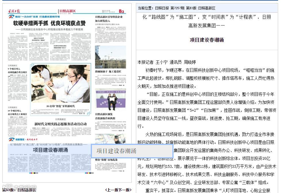 火热的施工现场背后,是日照高新发展集团抢抓机遇,勠力打造全市承接新旧动能转换、培育新动能高地的具体行动。日照科技创新中心项目是由日照高新发展集团、中南集团联合开发运营的集商务办公、科技研发、成果转化、孵化生产、创新创业、展示展览于一体的科技创新综合体。项目总投资16亿元,规划用地约153.7亩,建设楼房11栋,建筑面积约33万平方米,由产业技术研发、技术引进转移孵化、技术成果交易、科技金融服务、科技中介服务和学术交流“六中心”及众创空间、企业研发总部、专家公寓“三载体”组成。