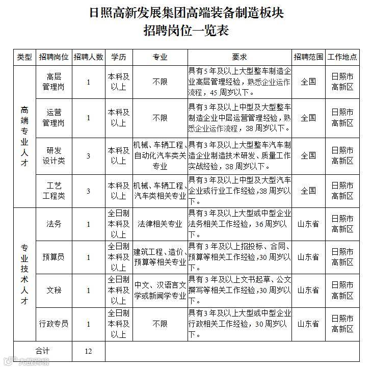 日照高新发展集团有限公司成立于2009年,是日照高新技术产业开发区管理委员会等出资设立的国有企业,为日照高新区提供优良的投资环境和生活环境,促进产业积聚和发展,注册资本5.6亿元人民币。为加快集团高水平、高素质人才队伍建设,根据业务开展情况,现集团高端装备制造板块面向社会公开招聘12名专业人才。