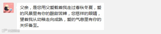 今天是父亲节~让我们把平日里对父亲的崇拜、感激、思念和深深的爱表达出来!你可以编辑一条信息,像他们一样~