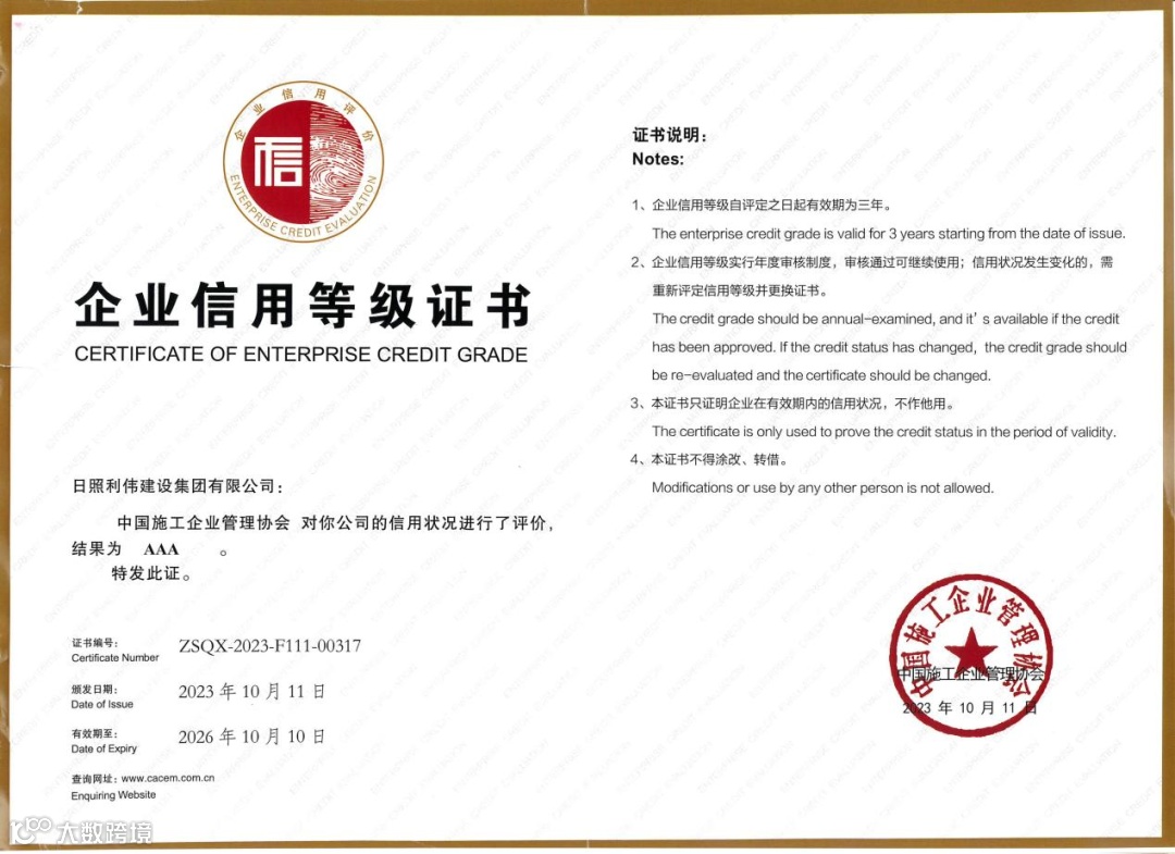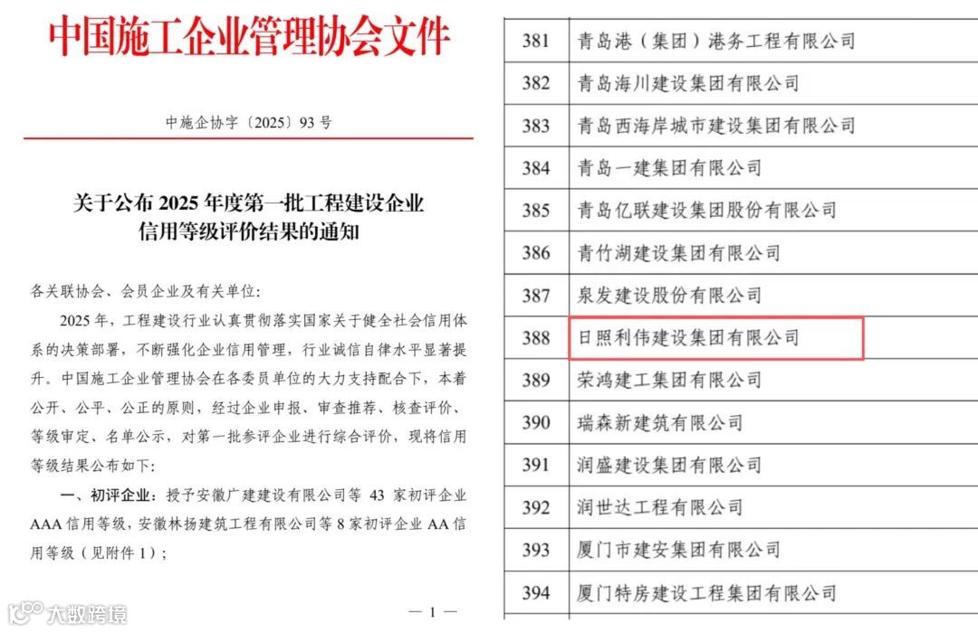 近日,中国施工企业管理协会正式发布《关于公布2025年度第一批工程建设企业信用等级评价结果的通知》。利伟集团凭借优质的履约记录、良好的行业口碑获得工程建设企业AAA信用等级认定!