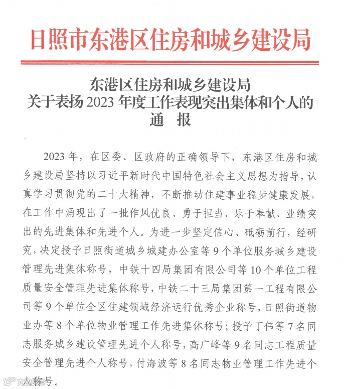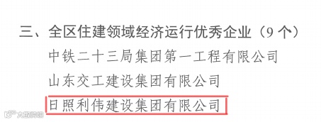 3月23日,东港区区住房城乡建设暨住建领域党风廉政建设工作会议顺利召开,日照利伟建设集团由于在2023年度的工作中企业表现优异、业绩突出,被授予“全区住建领域经济运行优秀企业”荣誉称号!