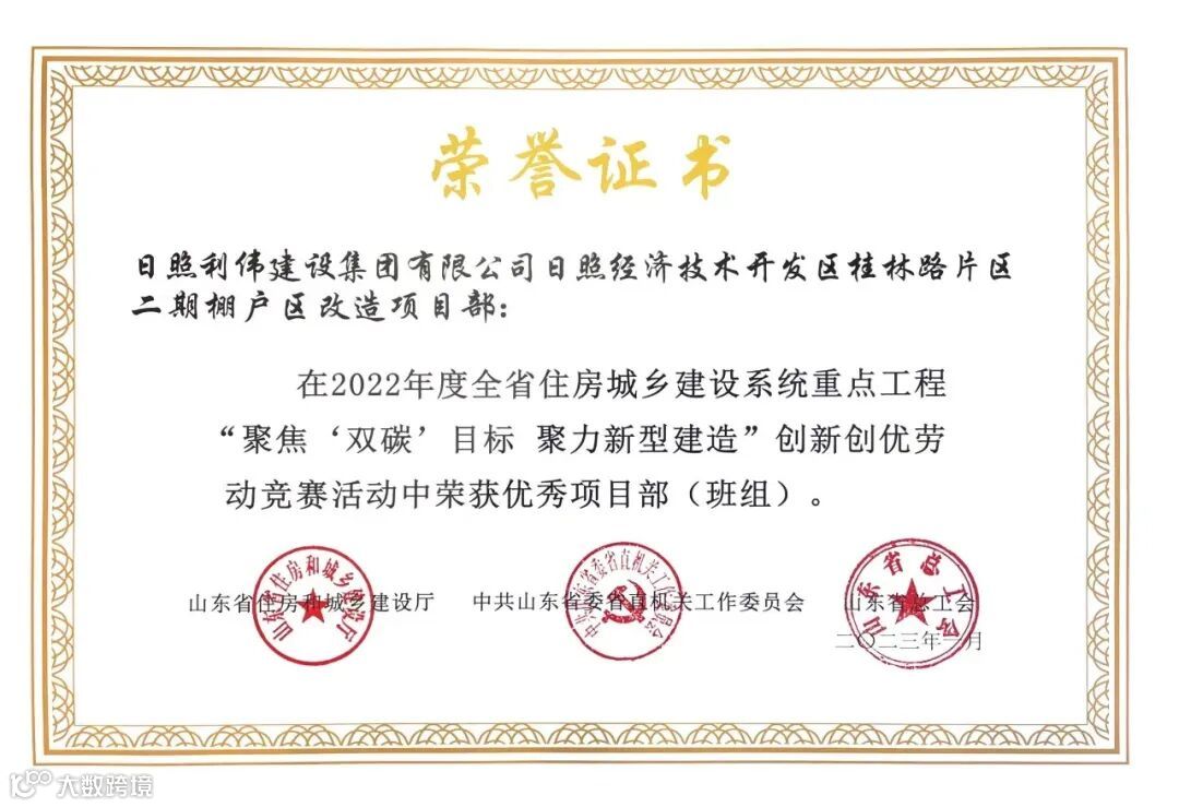 利伟集团始终大力弘扬工匠精神、劳模精神,积极采用绿色低碳环保等新技术、新工艺和智能化、信息化管理手段,全力打造优质工程、精品工程。以劳动竞赛为载体,激发广大职工的积极性和创新活力,以赛促干,以赛促练,全面提升企业管理水平,高质量高效率地完成了各项施工任务。推行劳动竞赛见行见效,在本次全省住房城乡建设系统重点工程“聚焦‘双碳’目标,聚力新型建造”创新创优比赛中取得了优异成绩,膺获“先进集体”荣誉称号。