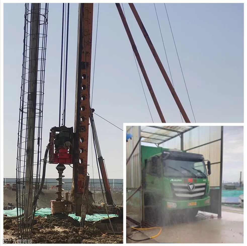 在桂林路社区二期项目,清槽、打桩工作在积极推进。土方外运的车辆有序进出,项目部严格使用喷淋设施冲洗车辆轮胎上的泥土,保持出入口清洁。