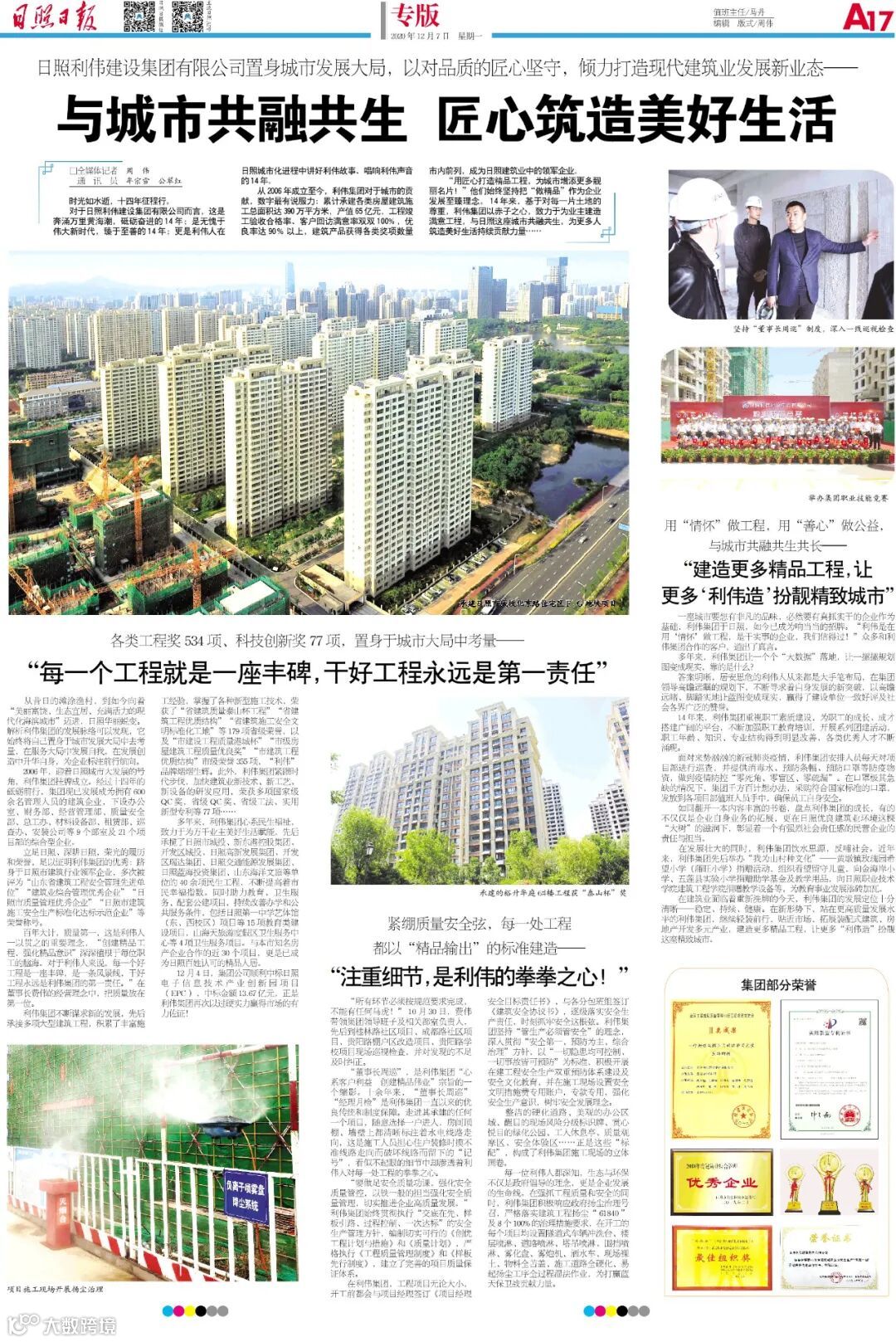立足日照、深耕日照,荣光的履历和荣誉,足以证明利伟集团的优秀:跻身于日照市建筑行业领军企业,多次被评为“山东省建筑工程安全管理先进单位”“建筑业综合管理优秀企业”“日照市质量管理优秀企业”“日照市建筑施工安全生产标准化达标示范企业”等荣誉称号。