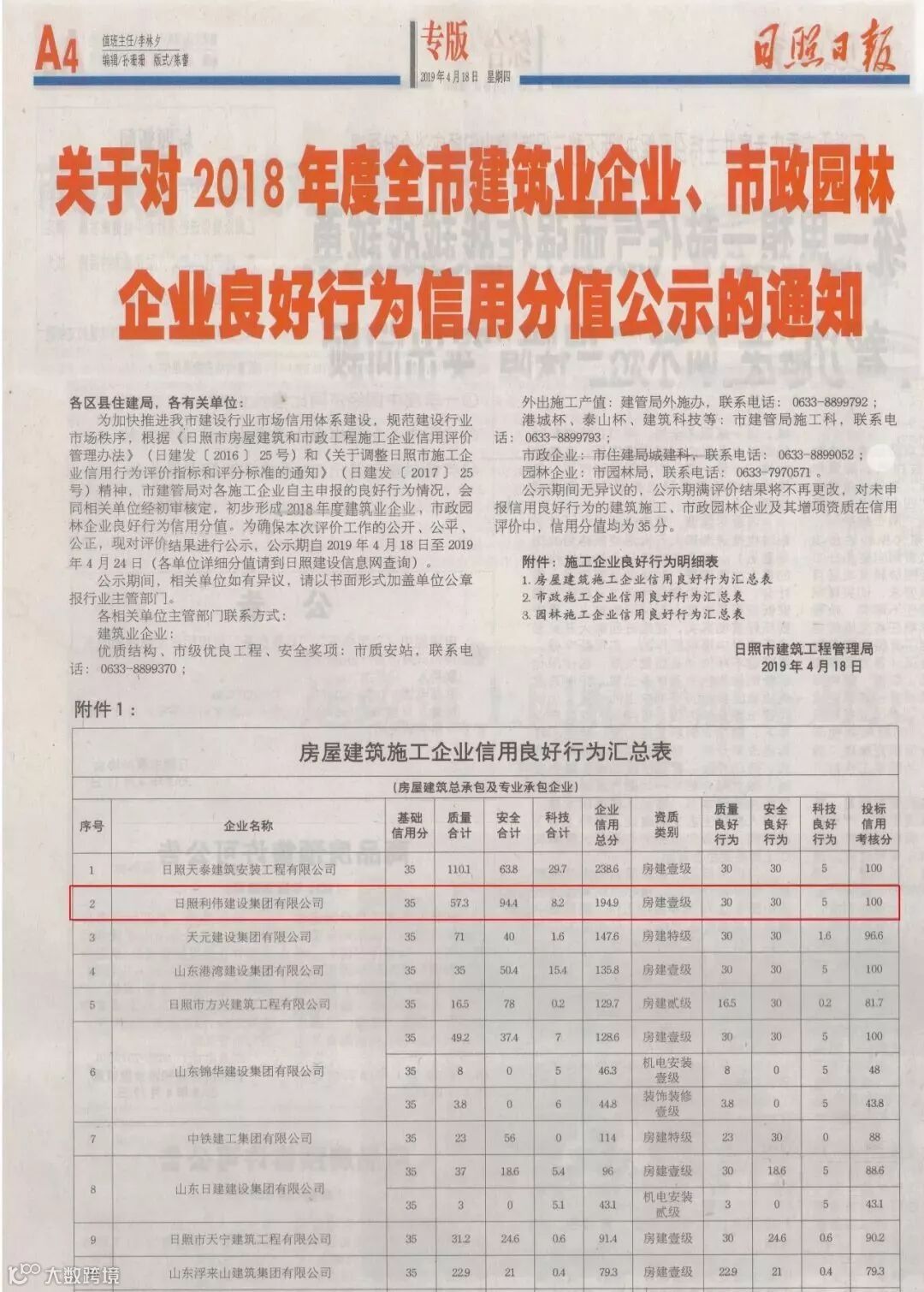 日前,从日照市建筑工程管理局传来喜讯,利伟集团在2018年度全市房屋建筑施工企业信用分值综合评定中,获得全市第二名的优异成绩。