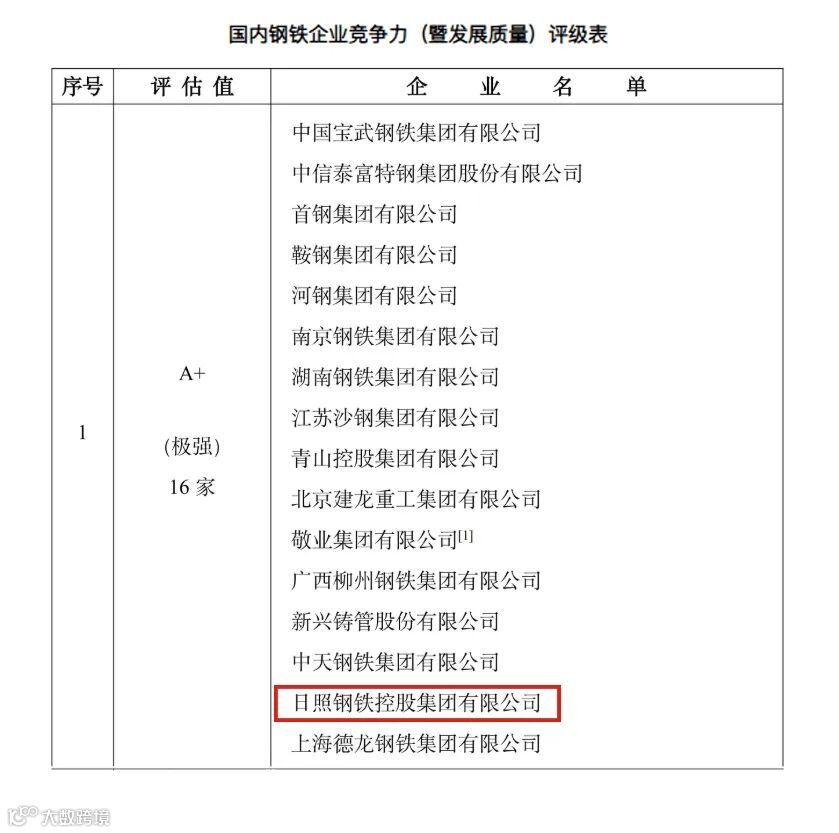近日,冶金工业规划研究院在北京举办新闻发布会,正式发布2025年度中国钢铁企业竞争力(暨发展质量)评级结果。日照钢铁控股集团有限公司(以下简称日照钢铁)凭借卓越的综合实力与高质量发展成效,再次获评竞争力A+(极强)钢企,至此已连续十年稳居该评级榜单。
