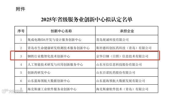 近日,山东省发展和改革委员会正式公示了2025年拟认定的省级服务业创新中心名单,京华日钢(日照)信息技术有限公司凭借其在信息技术领域的出色成就和持续创新能力,成功通过层层筛选,荣耀登榜,获评省级服务业创新中心。