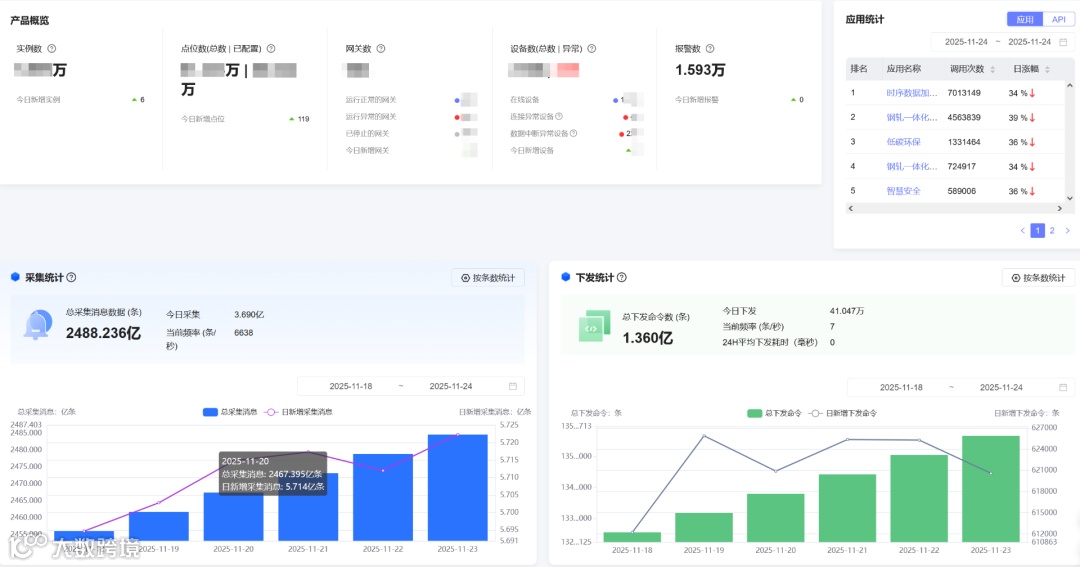 钢铁生产全流程涵盖采矿、烧结、炼铁、炼钢、轧钢等数十个环节,涉及数万台、套生产设备,从高温熔炉的温度压力到轧钢机组的转速精度,每一个数据都关乎生产安全与产品质量。在全流程智能工厂建设初期,日照钢铁便深刻认识到,OT数据作为生产现场的“第一手情报”,是实现智能化建设的基础前提。通过针对性打造“云边端”数据采集、存储与处理架构,配备高性能服务器集群和冗余存储系统,日照钢铁已完成100万余个OT数据点位的部署与接入,采集范围覆盖生产工艺参数、设备运行状态、能耗指标、质量检测数据等全维度生产要素,数据采集延迟从传统的秒级降至毫秒级,数据准确率达99.99%以上,为智能工厂的运行提供了坚实的数字地基。