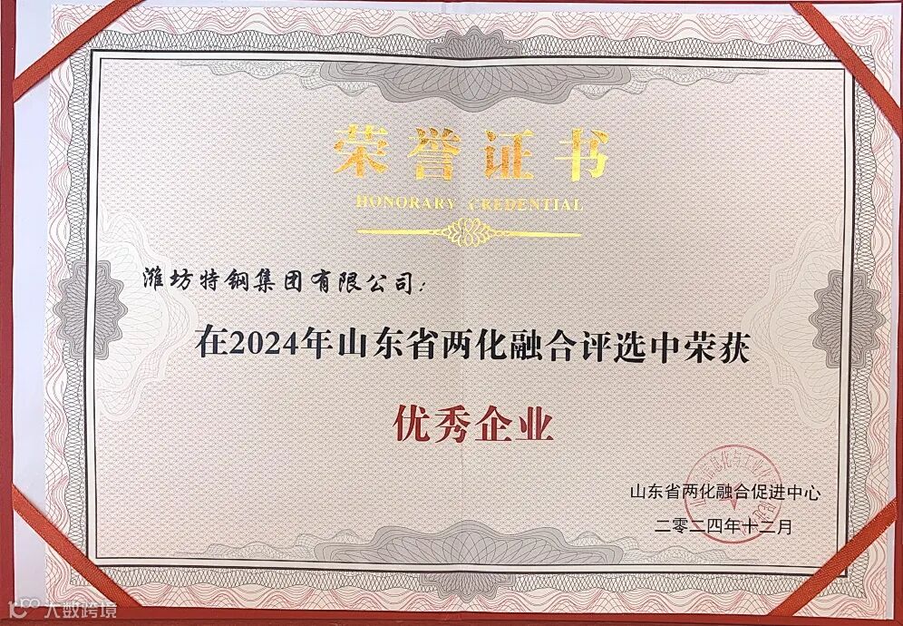 本次获奖已是潍坊特钢集团有限公司自2016年至2024年连续九年获此殊荣,代表着潍坊特钢“两化融合”工作成效显著。