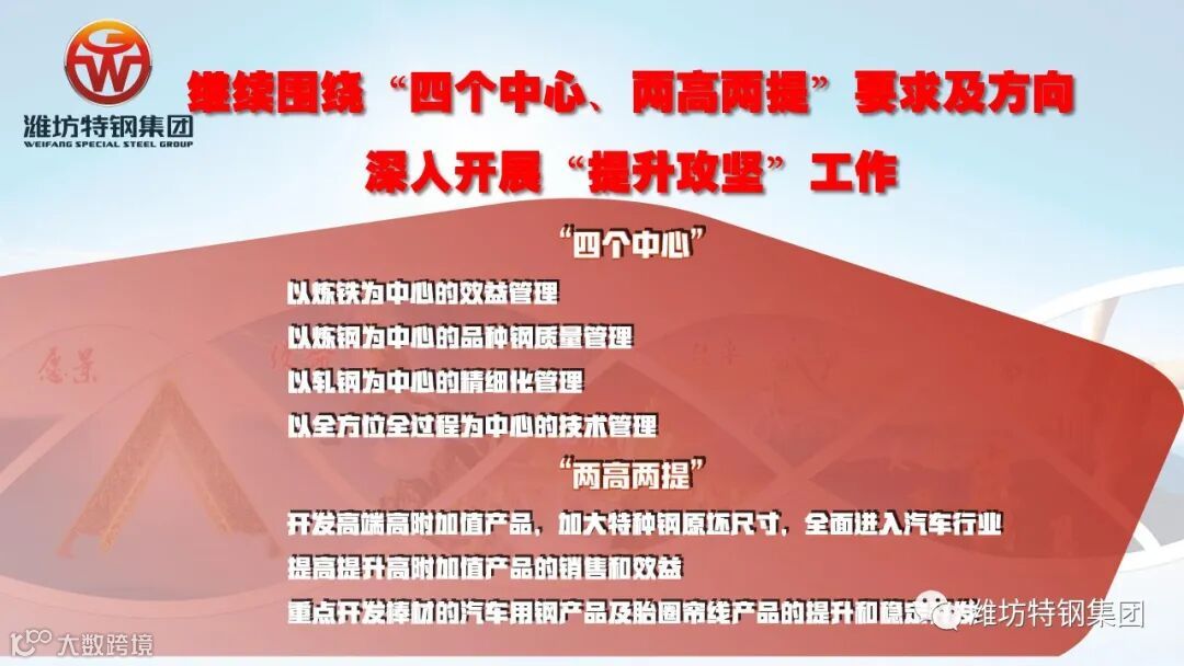 希望集团公司各分厂、部门把握本次会议的要点,根据各自职责范围,落实好会议要求,拿出具体工作开展方案,细化具体措施,明确任务目标,敲定时间节点,按步推进各项工作,全力以赴,圆满完成全年任务目标,为特钢集团持续、稳健发展做出应有的贡献。