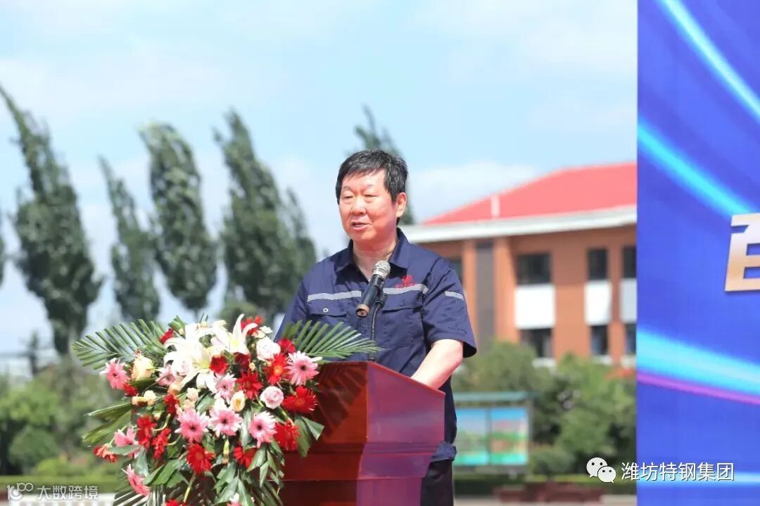 潍坊特钢集团董事长、总经理于光富发表致辞,对出席仪式的领导、来宾表示热烈欢迎和衷心感谢。介绍了潍坊特钢集团已全面完成超低排放改造,并将努力开展企业绩效创A,这也是企业就地转型升级,实现产城融合发展的必经之路。他指出,今年以来,潍坊特钢集团在清洁运输提升方面持续投资1亿余元,通过铁路专运线改造、新能源车采购等多措并举,计划9月份实现清洁运输比例全面提升至80%以上。本次新能源电动车清洁运输项目,在各级政府部门和中国重汽集团的大力支持下,经过近4个月的共同努力,实现顺利交付使用,也助力特钢集团企业绩效创A工作迈出坚实的一步。