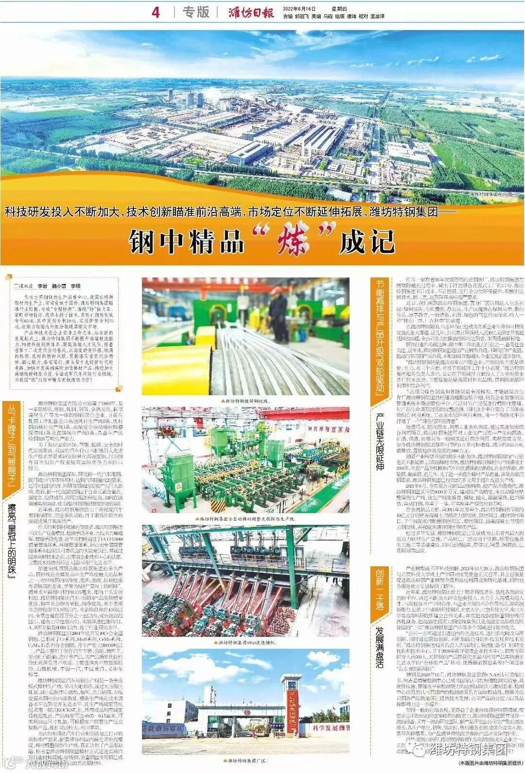 日前,《潍坊日报》整版对潍坊特钢集团不断提升高端线材制造能力,持续加大科研开发力度等方面进行了重点报道;高新新闻也针对潍坊特钢集团汽车用钢产品的开发、生产情况进行了专题报道。
