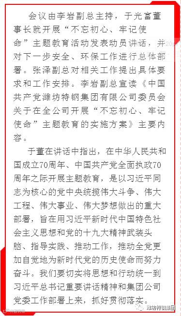 潍坊特钢集团召开“不忘初心、牢记使命”主题教育工作会议