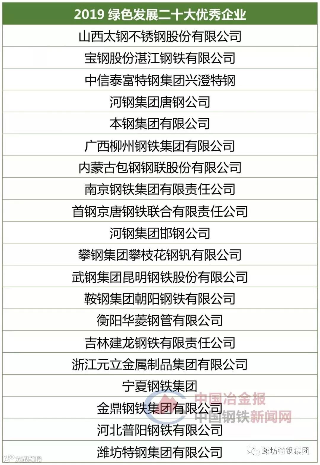 2019年6月5日——世界环境日,这将是铭刻于潍坊特钢发展史册和8000名“潍钢人”永久记忆的日子。这一天,潍坊特钢集团作为全山东省钢铁企业的唯一,跟首钢集团、宝钢股份、武钢集团等中国一流大型钢铁企业同时入选“2019绿色发展二十大优秀企业”!几代“潍钢人”顽强努力拼搏打造的“花园式绿色工厂”终于结出硕果,获得了业内专家和社会公众的一致认可!