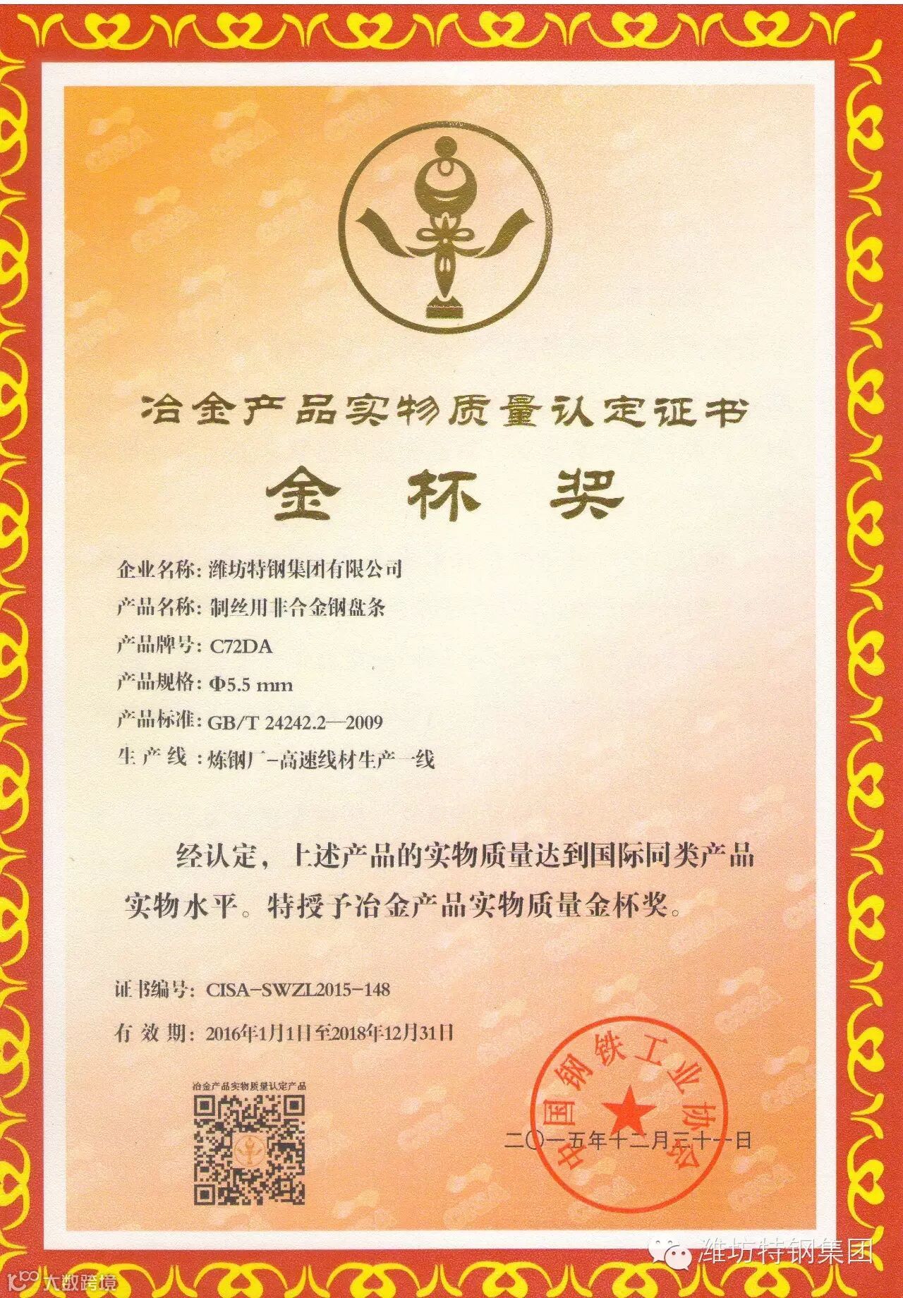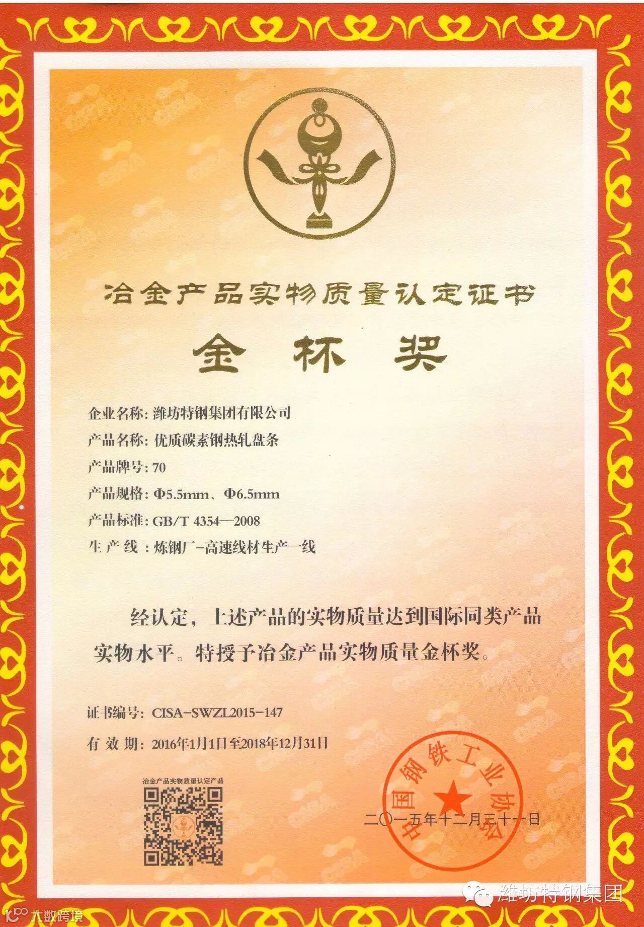 历时近一年,经过初审、复审、现场审查、专业评审、公示等认定程序,我公司制丝用非合金钢盘条C72DA、制丝用非合金钢盘条C82DA、优质碳素钢热轧盘条70等三种产品荣获中国钢铁工业协会颁发的冶金产品实物质量“金杯奖”。