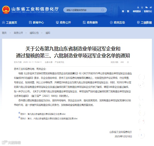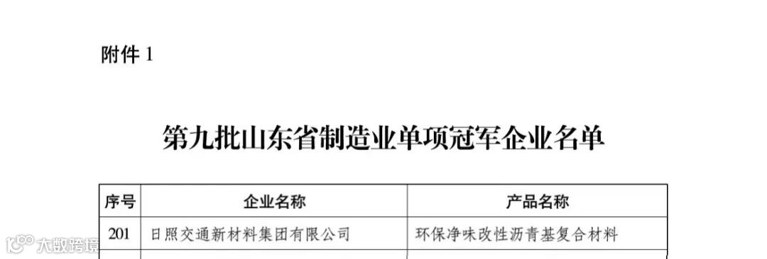 近日,省工信厅公布了第九批山东省制造业单项冠军企业名单,新材料集团凭借“环保净味改性沥青基复合材料”产品,荣获“山东省制造业单项冠军企业”称号。