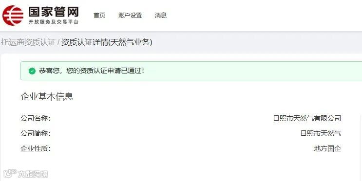 近日,集团所属天然气公司顺利通过国家管网集团开放服务及交易平台资质认证,成功取得国家石油天然气管网集团有限公司托运商资质,成为日照市首家具备全国范围内天然气管道输送资格的企业 。