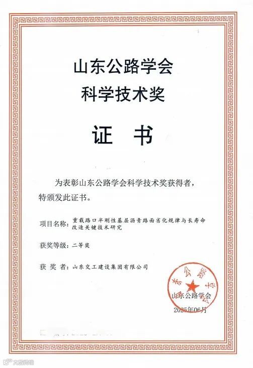 近日,山东公路学会组织评选的2025年度“山东公路学会科学技术奖”获奖名单正式揭晓,山东交建集团联合省交通科学研究院、市公路事业发展中心共同申报的创新成果——《重载路口半刚性基层沥青路面劣化规律与长寿命改造关键技术研究》荣获科技创新奖二等奖。
