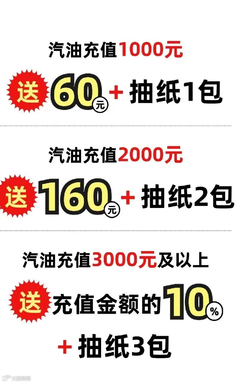 汽油充值3000元及以上,送充值金额的10%+抽纸3包。