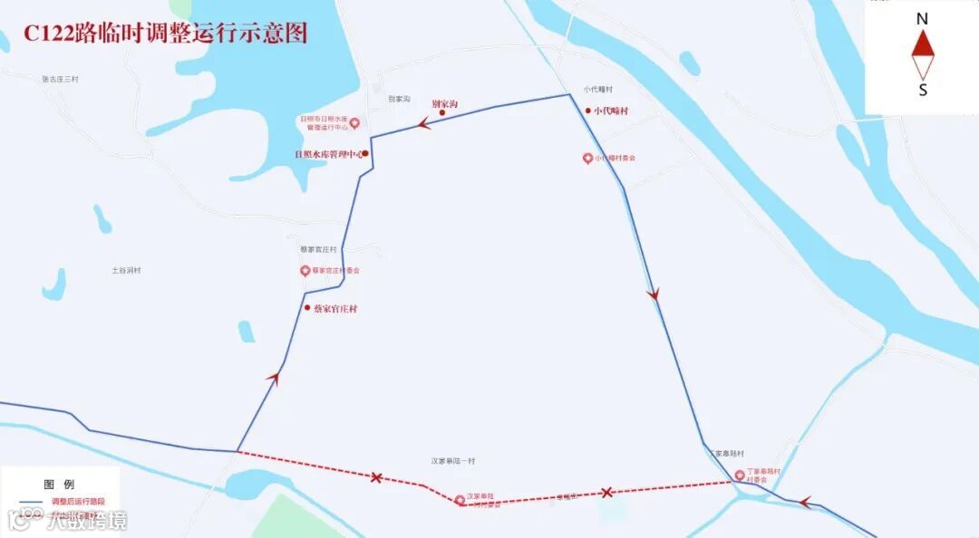 原“丁家皋陆社区”站往西经汉家皋陆一村至“马家店村北”站停止运行。临时调整为由“丁家皋陆社区”站往北,至小代疃村往西,至“日照水库管理中心”站往南,经蔡家官庄村至“马家店村北”站往西恢复原线路运行。其他运行路段不变。