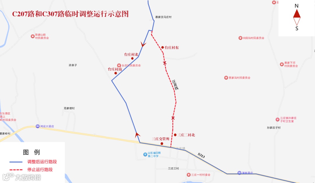 原运行汪黄线(S313-“惠家沈马庄村南”站)路段停止运行。临时调整为由S313向西,至三庄交管所西侧道路向北,至台庄村向东,至汪黄线向北恢复原线路运行。其他运行路段不变。