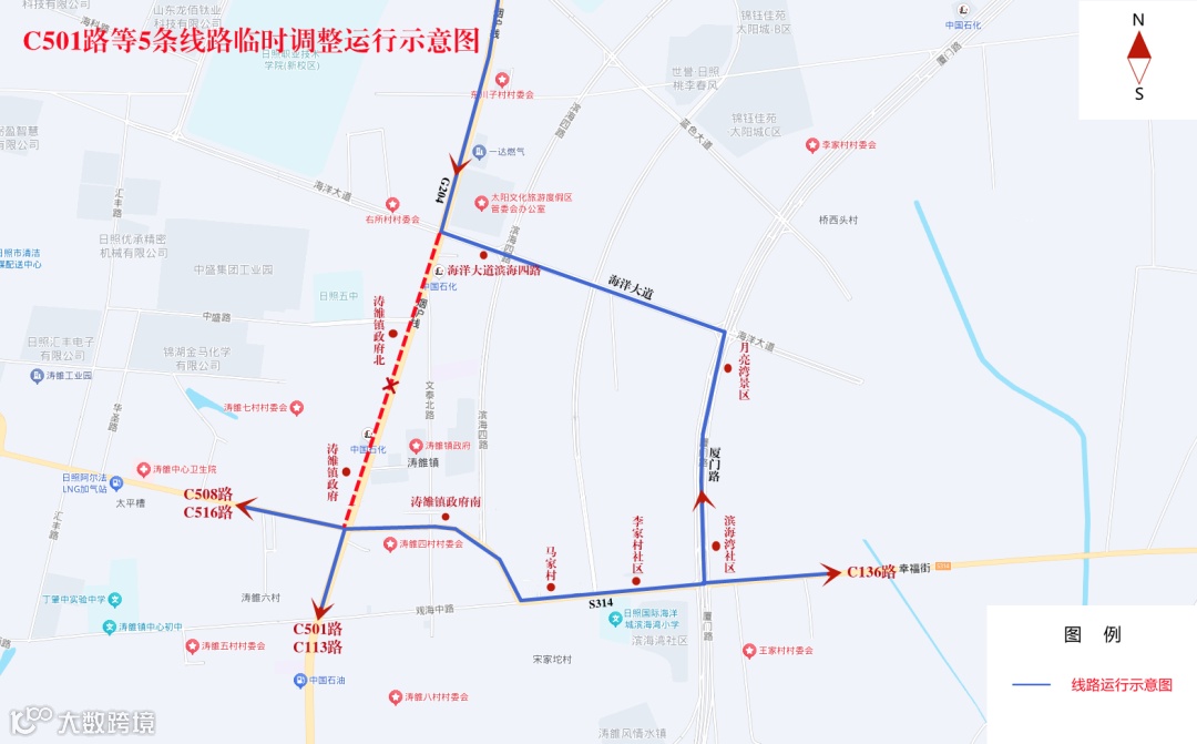 因G204烟沪线涛雒桥危旧桥改造工程施工,影响途经该路段的C501路、C113路、C136路、C508路和C516路正常通行。经研究,自施工之日起(公告封闭时间自2025年4月12日至2025年6月30日)对以上线路部分路段进行临时调整,待施工结束后再恢复原线路运行。具体调整情况如下: