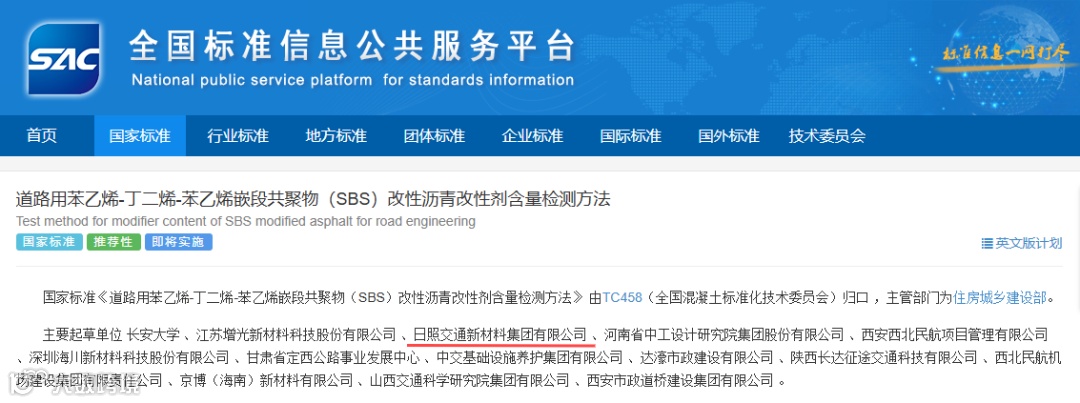 近日,由长安大学主编,日照交通新材料集团有限公司等单位参与编写的国家技术标准《GB/T45464-2025道路用苯乙烯-丁二烯-苯乙烯嵌段共聚物(SBS)改性沥青改性剂含量检测方法》正式发布,将自2025年10月1日起实施。