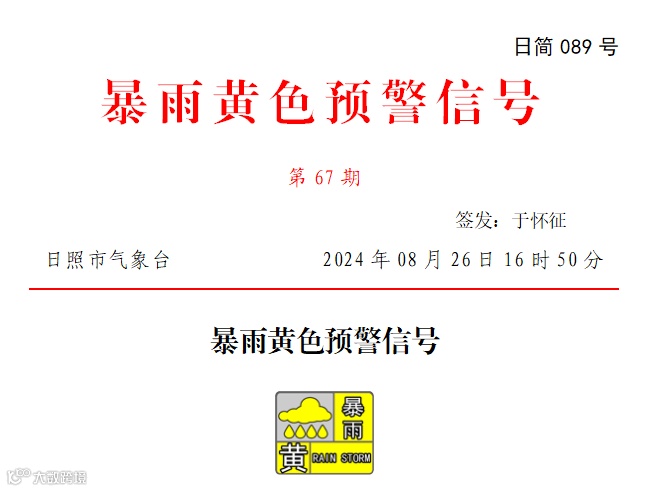 日照市气象台2024年08月26日16时50分发布东港区、岚山区暴雨黄色预警信号:预计今天傍晚到明天,东港区、岚山区所辖乡镇街道将出现明显降水并伴有雷电,平均降雨量30~60毫米、局地100毫米以上,小时最大雨强40~60毫米。