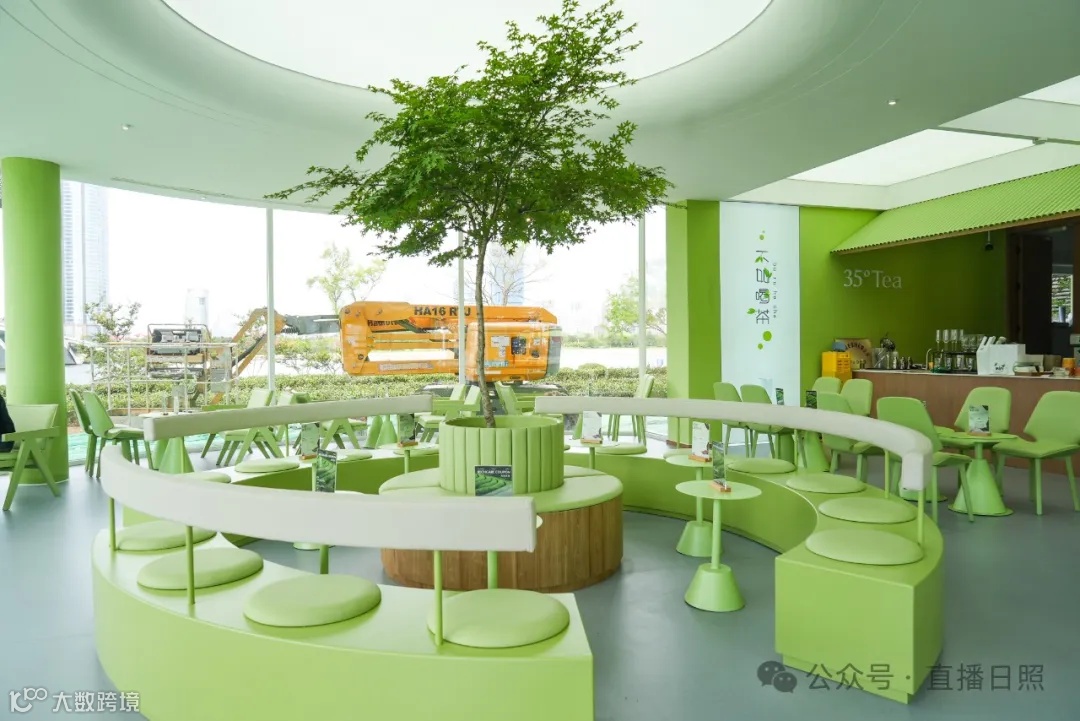 作为日照绿茶旗舰店的首家门店,35°Tea不同于传统茶叶旗舰店,巧妙地将新中式茶饮文化融入其中,打破了传统茶叶店仅限于茶叶展示和销售的单一功能,不仅展示了新中式茶饮的风尚,还实现了优质茶企茶叶展销、茶文化展示以及茶空间消费的完美融合,成为新概念版的茶叶旗舰店。