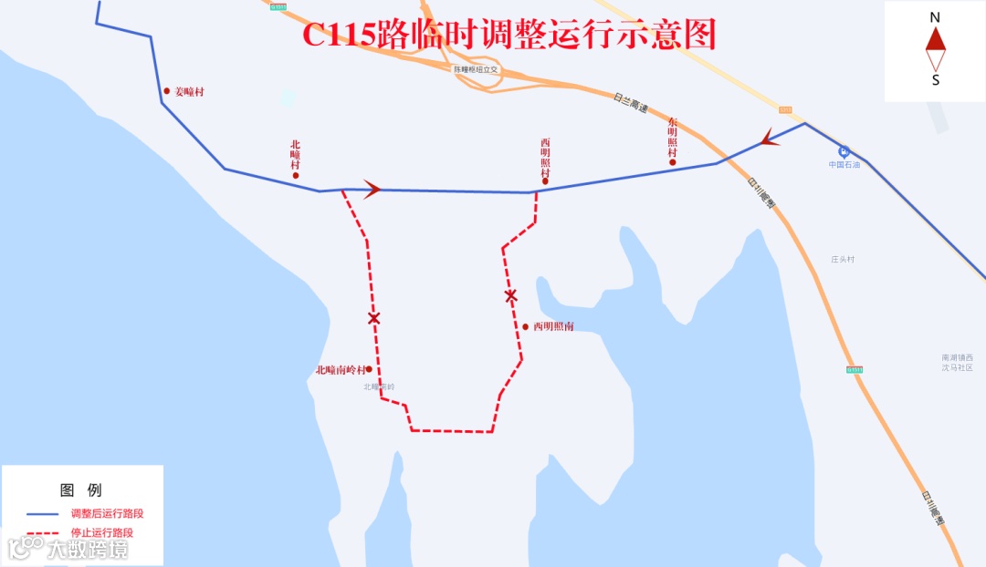 1.C115路(日照路首末站-姜疃):调整后,原西明照村向南,经北袁家庄、丁家沟村至北疃南岭村路段往返暂停运行。临时调整为由西明照村向西至石灰窑村南恢复原线路运行。其他运行路段不变。