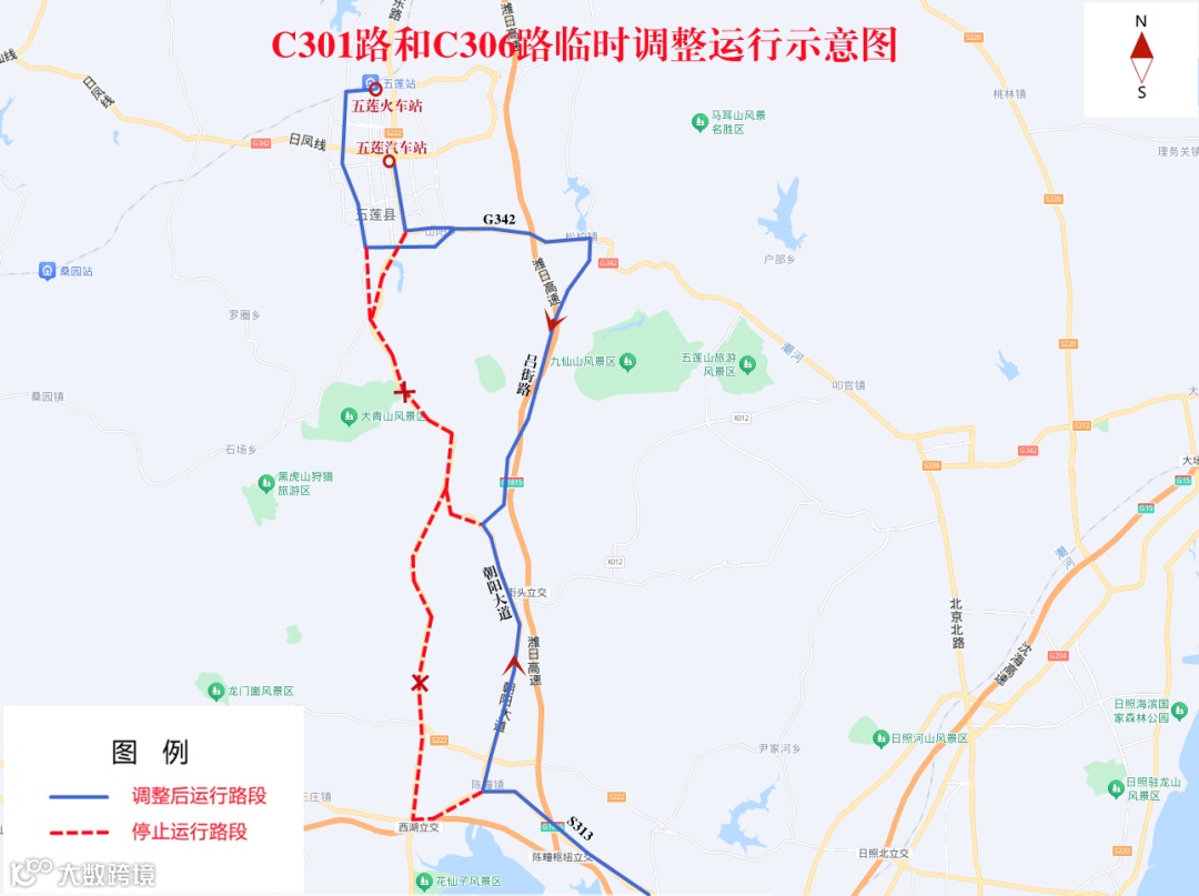 4.C306路(日照西站-五莲火车站):调整后,原S313(S222老线至S222新线路段)、S222新线(S313至五莲山路路段)往返暂停运行。临时调整为由S313与S222老线交叉口向北,至致富街向西,至五莲县山海路向北,至吕街向北,至G342向西,至S222向南,至五莲山路向西,至滨河路恢复原线路运行。其他运行路段不变。
