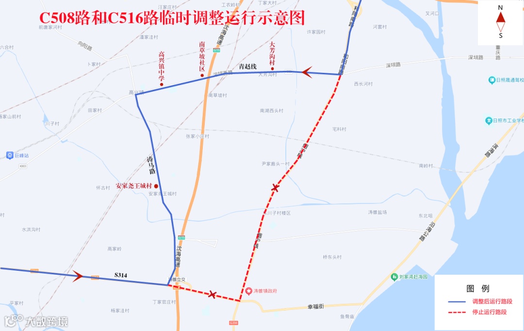 5.C508路(日照西站-碑廓)、C516路(日照路首末站-小王家沟):调整后,原G204(青赵线至S314路段)、S314(G204至涛马路路段、茶香大道至S222路段)往返暂停运行。临时调整为由G204与青赵线交叉口向西,至涛马路向南,至S314向西恢复当前线路运行。其他运行路段不变。
