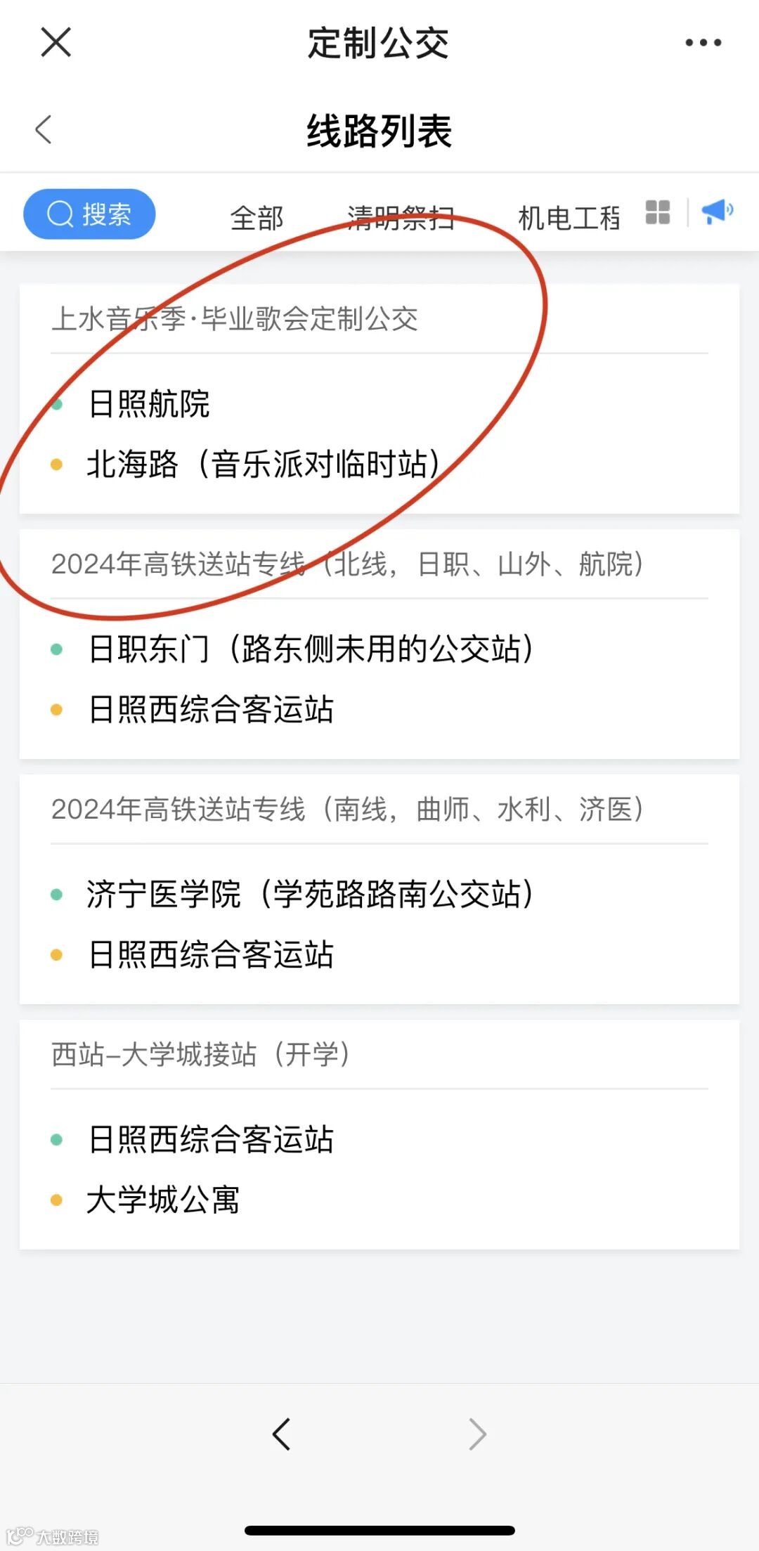 此条定制公交线路,去程发车站点涵盖日照航院(路南)、外国语大学(路南)、职业技术学院(路西)、济宁医学院(路南)、公交商务宾馆(路西)、曲师大附校(路西)六个站点,中途不停车,直达北海路的音乐派对临时站点。返程由音乐派对至曲师大附校(路东)站依次运行至日照航院(路北)站。