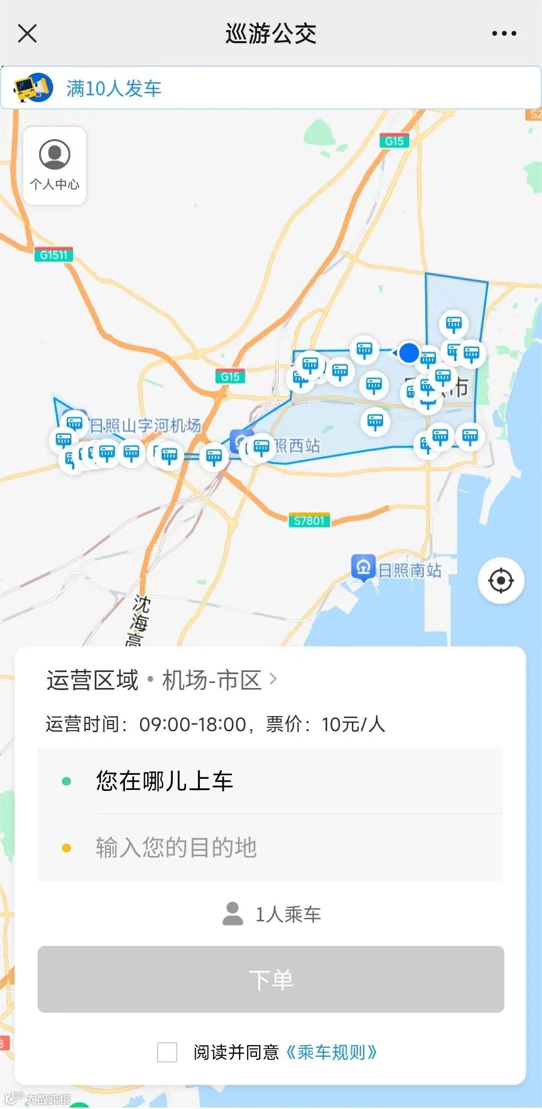 站在日照机场停车场,就能看见一趟白色涂装的巡游定制公交抵达,乘客通过电子车票上车,车辆迅速驶离。这趟巡游公交由日照机场直达市区,票价十元,无指定行驶路线。