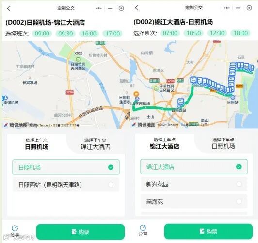 该线路由锦江大酒店始发,经太公岛二路、学苑路、烟台路、海曲路、丹阳路、和阳南路、S220、机场路至日照机场往返运行,票价10元。您可通过微信搜索“日照城乡快速公交”小程序线上下单,选定上车站点及下车站点后,定制公交将按照乘客下单站点运行,其他站点不停靠、不载客,为您提供“点对点”高效便捷服务。