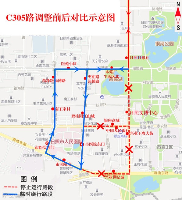 调整后,北京路(海曲路-淄博路路段)往返暂停运行。线路由北京路经淄博路、菏泽路、海曲路至北京路恢复原线路往返运行。临时撤销“日照文博中心、兴业王府大街”2个站点,临时增加“木浆厂生活区北、医苑小区、菏泽路淄博路、南王家村、市医院西门、临商银行日照分行(路南)、市医院南、兴业世纪城”8个站点。其他运行路段不变。