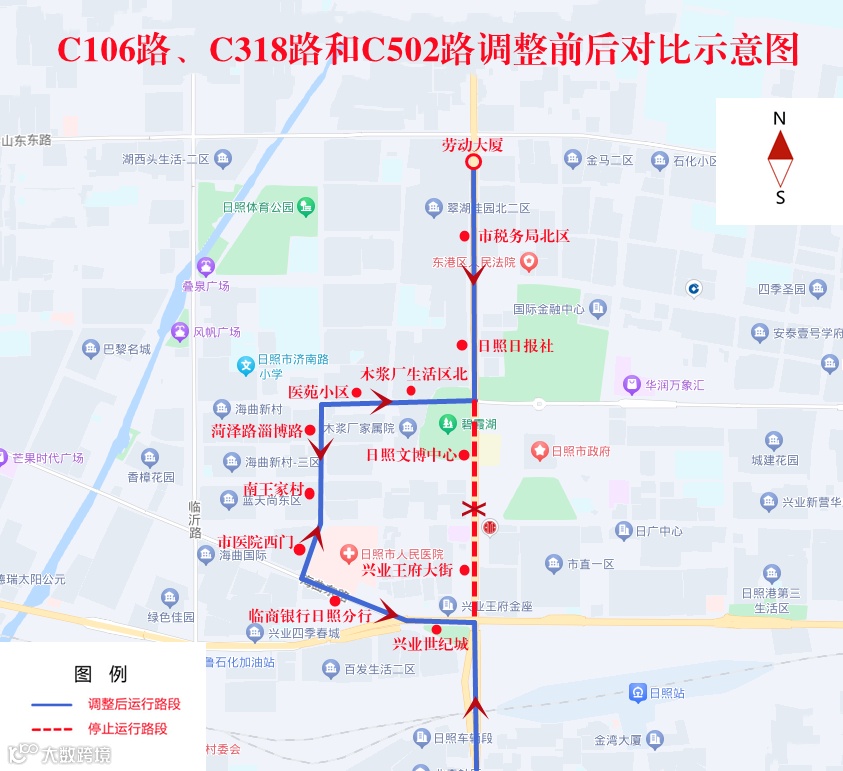 一、C106路(劳动大厦-日照机场)、C318路(日照西站-白鹭湾)和C502路(劳动大厦-岚山区政府)调整情况: