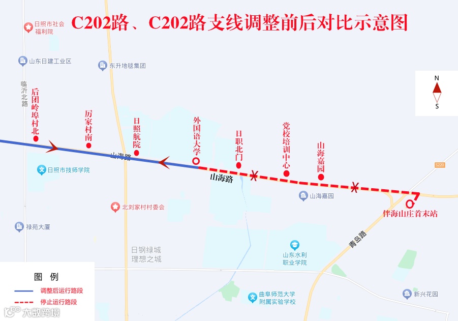 调整后,山海路(烟台路至伴海山庄首末站路段)往返暂停运行。日照方向起讫站点由“伴海山庄首末站”站临时调整为“外国语大学”站。临时撤销“伴海山庄、山海嘉园、党校培训中心、日职北门”4个站点。其他运行路段不变。