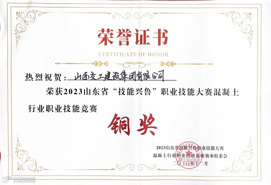 近日,山东硅酸盐学会、山东省建设工会委员会、山东省轻工集体企业联社联合举办2023年山东省“技能兴鲁”职业技能大赛混凝土行业技能竞赛,山东交工建设集团代表队获得铜奖。