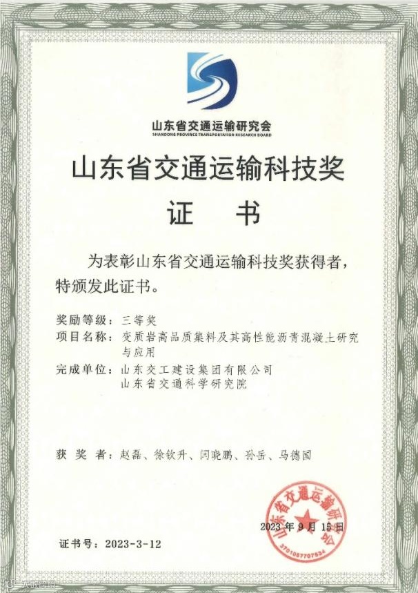 近日,集团一批科技创新实用成果、开发项目、QC成果斩获多项荣誉。山东交工建设集团《沥青路面水泥稳定碎石基层长寿命施工关键技术及工程应用》荣获2023年度“山东省交通运输科技奖”一等奖,《变质岩高品质集料及其高性能沥青混凝土研究与应用》荣获2023年度“山东省交通运输科技奖”三等奖,《基于基层韧性提升的新一代长寿命沥青路面施工技术》荣获2022年度“日照市科技创新成果名单”二等奖,《提升声屏障吸声板安装施工效率》《利用PLC模组控制系统有效降低粉罐顶溢料概率》两项QC成果获全省交通行业优秀质量管理小组二等奖,《水泥稳定碎石侧向供料双层连铺施工工艺研究》等三项QC成果获全省交通行业优秀质量管理小组三等奖。山东蓝能智能科技有限公司的《城市级智慧停车平台建设开发项目》成功入选“2023年度省住房城乡建设科技计划项目”名单。