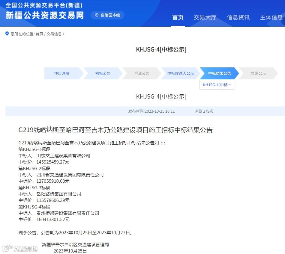 10月27日,新疆公共资源交易网中标结果公示结束,山东交工建设集团成功中标G219线喀纳斯至哈巴河至吉木乃公路建设项目第KHJSG-1标段,中标金额1.46亿元。这是山东交工建设集团实施“走出去”战略以来,中标的又一个省外施工项目。