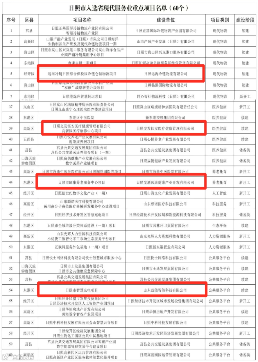 近日,省发展改革委印发《省现代服务业重点项目库入库项目名单》,我市列入省现代服务业重点项目60个,总投资284.92亿元,数量位居全省首位。其中,集团投资建设的高新区医疗康养中心、日照市颐康养老服务中心、日照市智慧充电等3个项目入围项目库名单;集团参股合作的远海冷链日照综合保税区冷链仓储物流项目入围该项目库。