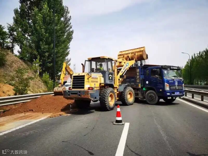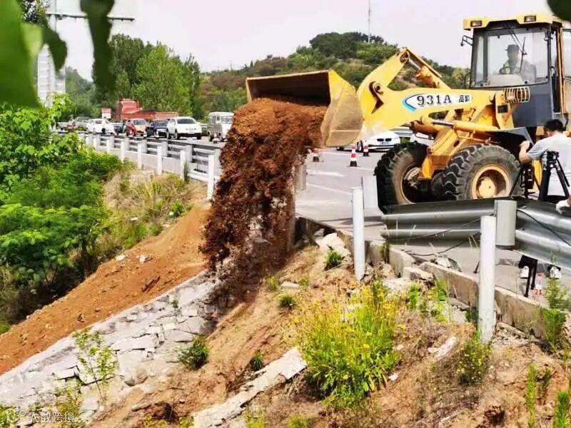 边坡坍塌抢通演练中,防汛抢险队伍组织装载机、挖掘机、运输车等抢险机械赶赴现场进行道路抢通,通过机械配合人工及时将路面砂石、淤泥清理干净,最后使用洒水车将路面冲刷干净,公路恢复通行。