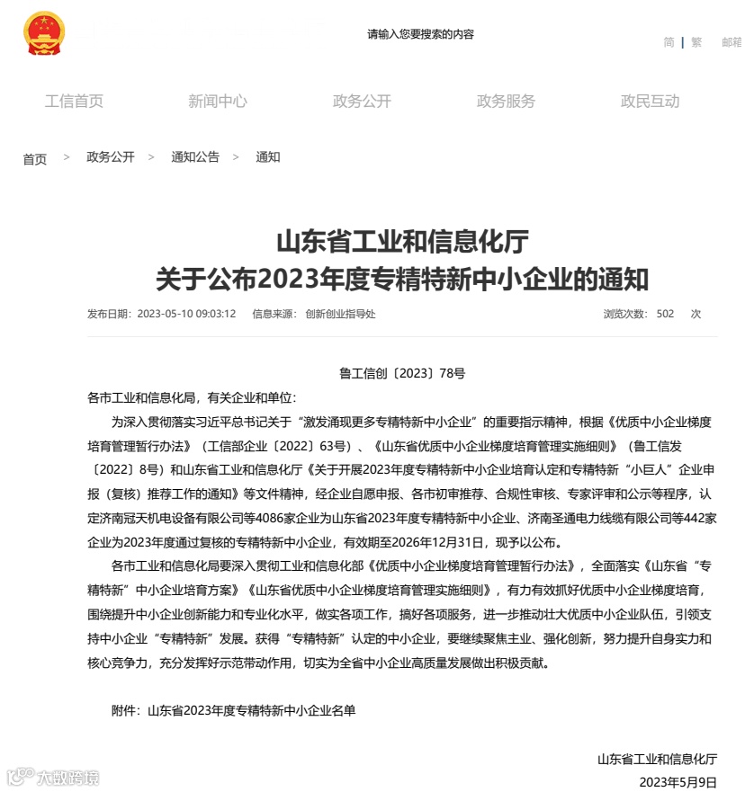 5月10日,山东省工业和信息化厅公布了2023年度山东省“专精特新”中小企业名单,集团所属的公路材料公司、蓝能科技公司、阳光合源公司、晟华管业公司成功通过认定。