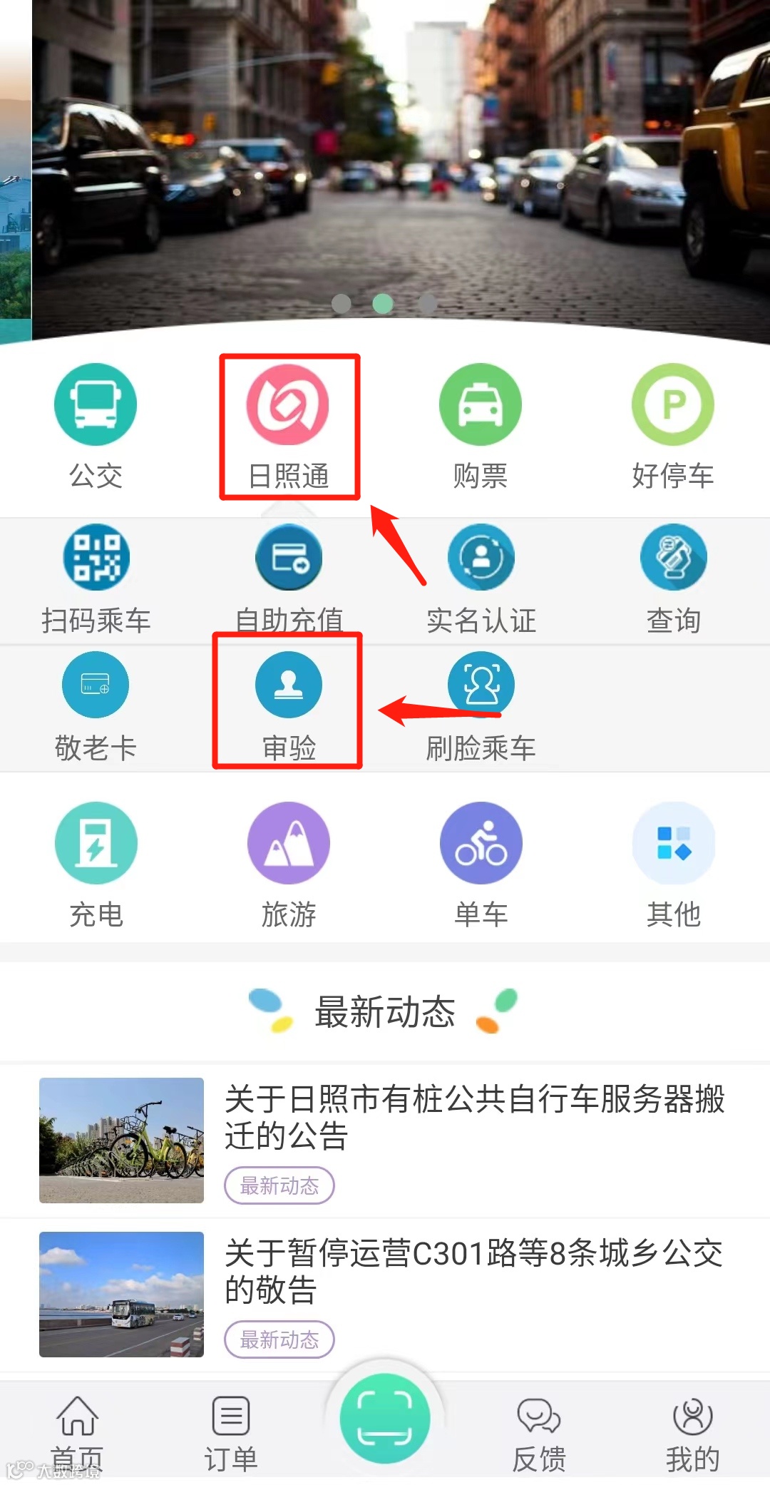 2.打开“新出行”APP,点击功能栏中“日照通——审验”进入审验界面;