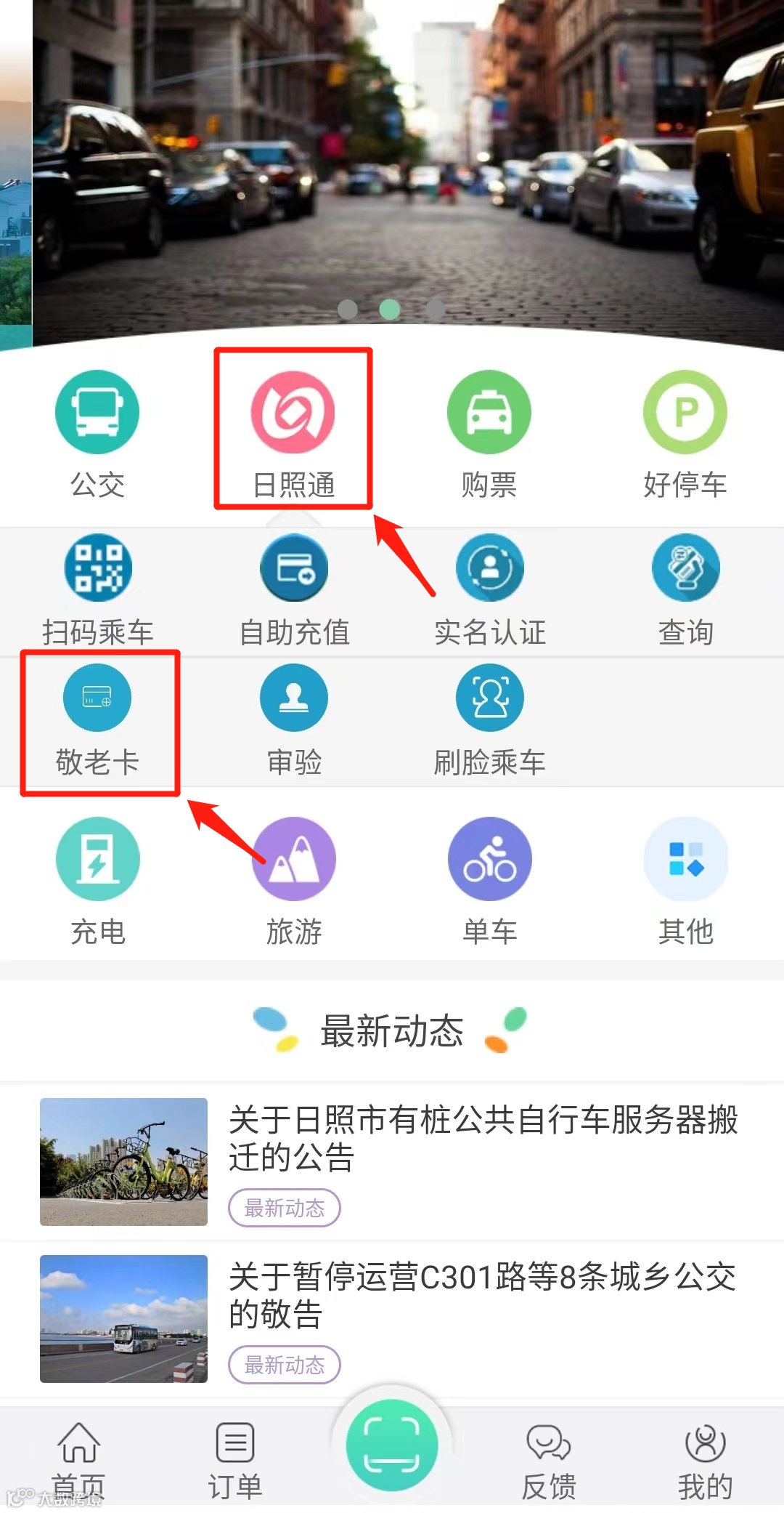 2.打开“新出行”APP,点击功能栏中“日照通——敬老卡”进入办理界面;