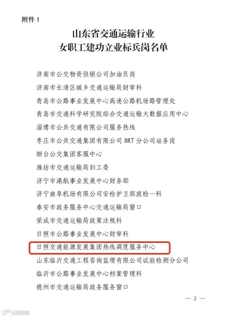 此外,集团热线调度服务中心被省交通工会评为“山东省交通运输行业女职工建功立业标兵岗”,集团赵光娜被市妇联评为“日照市优秀巾帼奋斗者”