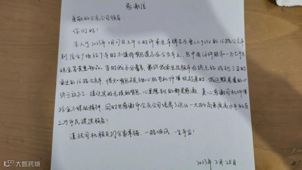 与此同时,失主也通过公交服务热线3656666联系到了公共汽车公司三分公司,说明了上车后丢失包的情况。根据乘客的描述,王聪师傅拿出了自己已经妥善保管好的背包,失而复得的乘客以一封感谢信表达了对驾驶员王聪的感谢。王聪师傅对乘客的表扬谦虚地说:“这只是一件小事,我们的工作就是让您放心满意。”