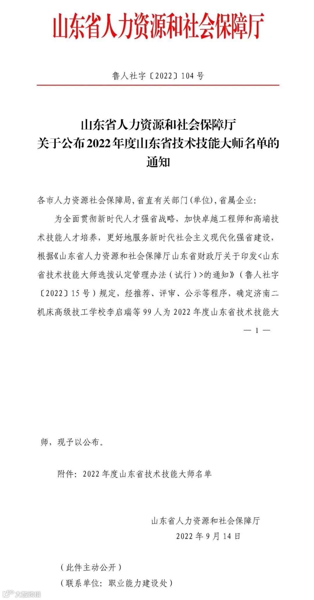 据悉,山东省技术技能大师是指在我省行政区域内各类院校、科研院所和行业企业中,在教育教学、科学研究、生产经营等一线工作,具有高水平专业技术能力和高超技能技艺水平,并具有较强创新创造能力和社会影响力的优秀复合型技术技能人才。
